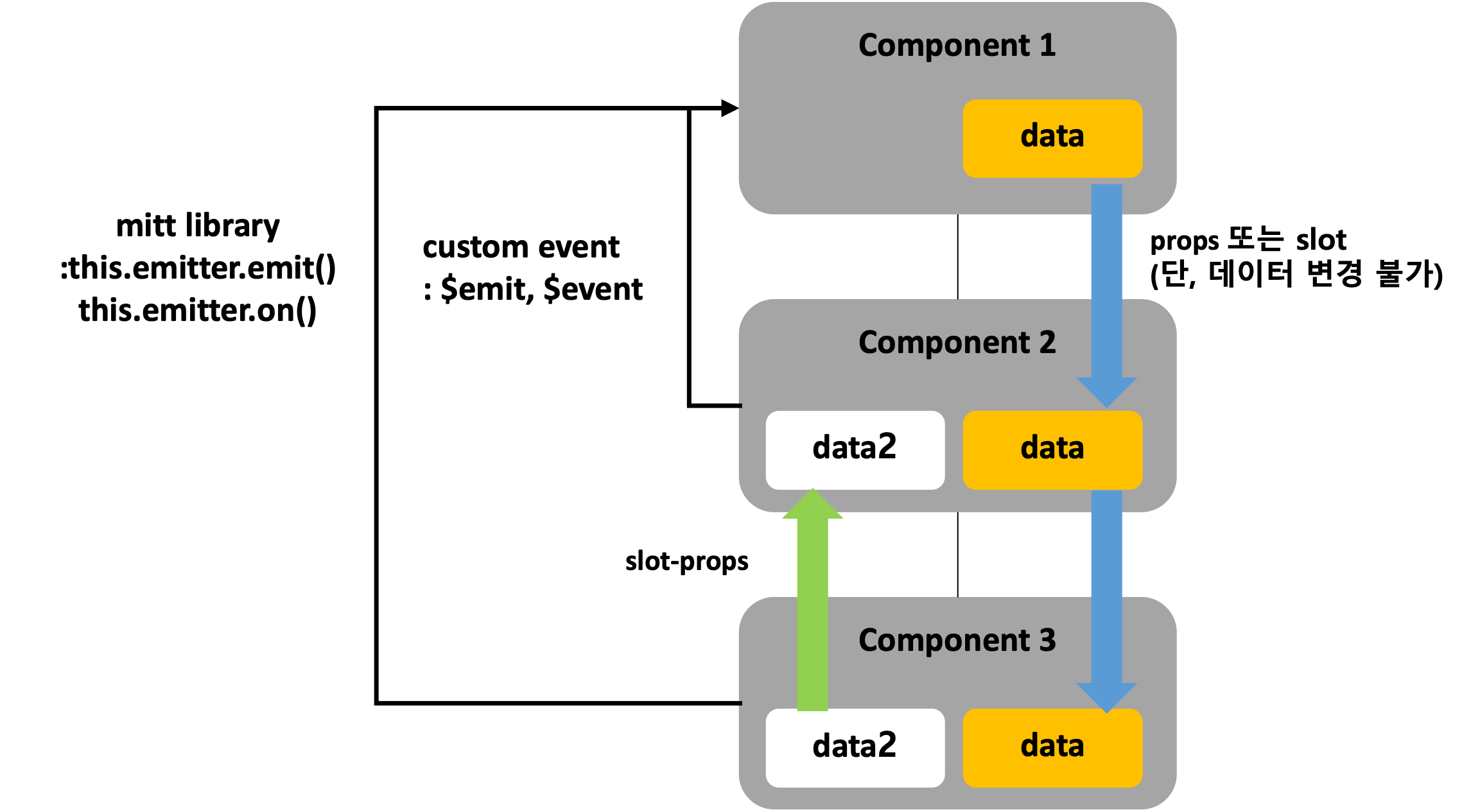 - 여러단계 컴포넌트를 거슬러 이벤트 전달 시 mitt라이브러리 설치 후 사용